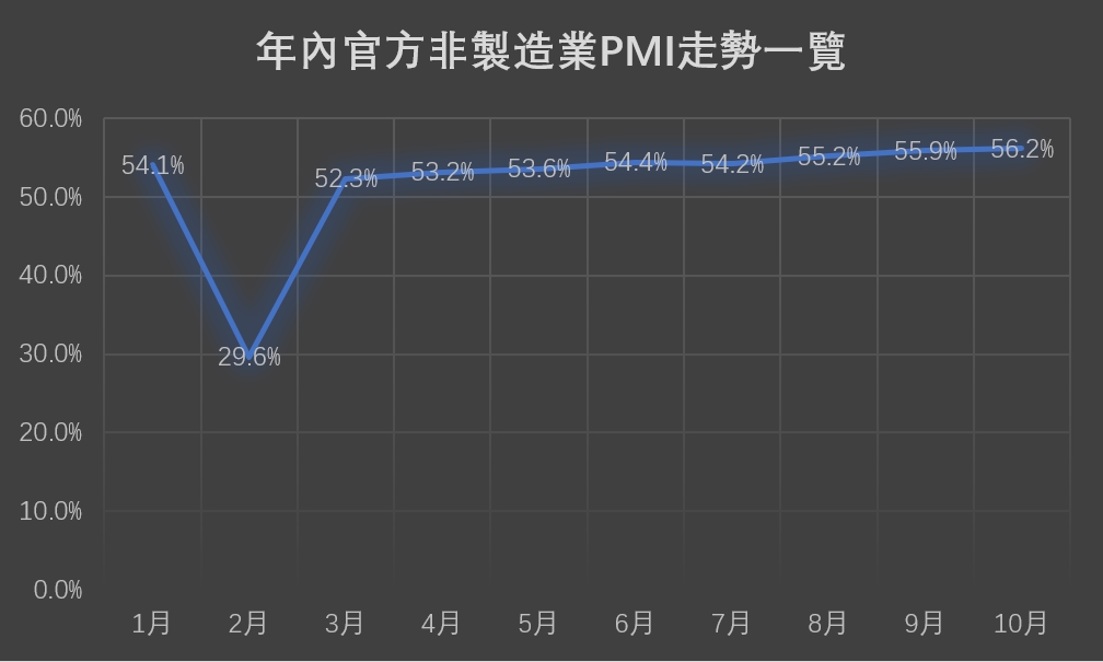 (香港文匯網記者 倪巍晨 上海報道)國家統計局數據顯示,10月中國非製造業PMI報56.2%,較前值提升0.3個百分點,已連續第3個月保持升勢。國家統計局服務業調查中心高級統計師趙慶河介紹,上月服務業恢復勢頭向好,建築業亦延續較快增勢,總體看非製造業復甦步伐有所加快。有受訪專家指出,上月中國非製造業PMI已升見2013年11月以來新高,表明在近期終端需求持續恢復推動下,服務業的復甦明顯加速,這也是當月非製造業PMI進一步攀升的主因。