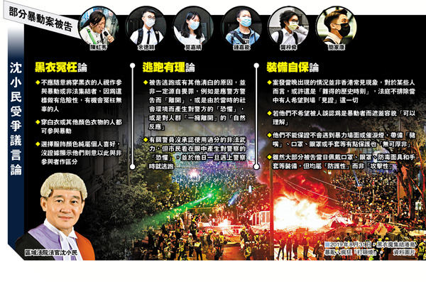 在去年8.31灣仔暴動案中,有8名男女被控參與暴動,其中女社工陳虹秀早前在區域法院被裁定表面證供不成立,當庭釋放。法官沈小民昨日裁定餘下7名被告全部罪名不成立。他在裁決時接納辯方的部分看法,稱不排除眾被告是希望到場「見證」這「難得的歷史時刻」。針對他們身穿黑衣,沈官稱「選擇服飾顏色純屬個人喜好」,而帶備「豬嘴」、口罩、眼罩或手套等用作「保護自己」也是「無可厚非」的,更稱眾被告遇警即逃有可能是「應警方警告而離開」,甚或基於對警方的「恐懼」的「自然反應」。7名被告全部「甩身」,令社會嘩然,攬炒派則「拍手稱快」,借沈官判詞替黑衣人鳴冤。