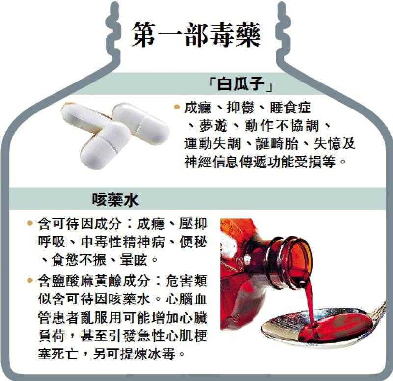 據了解,該男子購買的是俗稱「白瓜子」的藥物,屬「第一部毒藥」。他私下向記者透露,若講明買「白瓜子」,店員不會出售,必須說「65蚊十粒」或「十粒」之類的暗號以作識別;而買咳藥水,不能直呼「咳藥水」,而是說「買水」、「汽水」之類,店員自會心照。