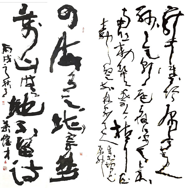 狀態書法雖然非關文字,但看上去,筆法與章法和傳統書法又非常相近。以點劃為情性,使轉為形質,橫如「千里陣雲」、豎如「萬歲枯藤」、捺如「浪崩雷奔」……既有法度,卻又心法無軌;意在筆前,又天馬行空;有其形,又無跡可尋,隱隱然自有其神。