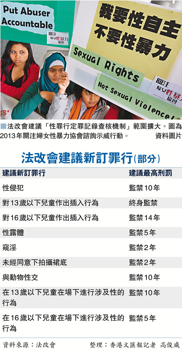 香港文匯報訊(記者 高俊威)法律改革委員會轄下性罪行檢討小組委員會,昨日發表諮詢文件,提出將現行「性罪行定罪記錄查核機制」擴展至涵蓋所有現有僱員、自僱人士及志願工作者,並建議訂立30項新罪行,包括窺淫及未經同意下拍攝裙底罪,而在兒童面前進行性行為亦列為罪行。委員會強調各項建議旨在促進討論,不一定代表是最終結論。