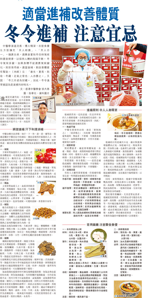中醫學源遠流長、博大精深,在飲食養生方面講究「天人相應」、「天人合一」,順應自然,適應春夏秋冬四時氣候和晝夜規律,以保持人體的陰陽平衡。 冬令氣候多變,如果身體不能適應氣候變化,則容易得病。適當進補,對改善體質有幫助。《內經》云:「春生、夏長、秋收、冬藏,是氣之常也;人亦應之。」又說:「冬三月者為封藏。」因此,冬令通常被認為是進補的好時光。■文︰香港中醫學會 徐大基 圖︰新華社、資料圖片