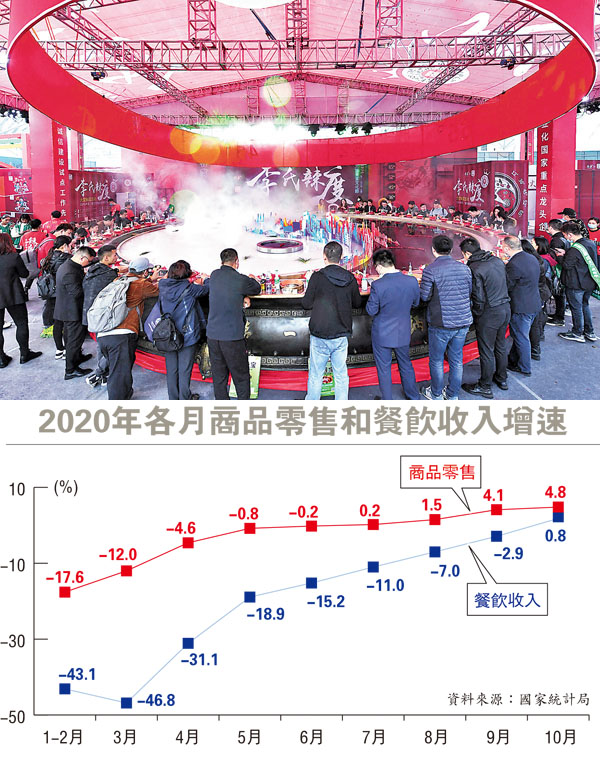 香港文匯報訊(記者 海巖 北京報道)10月內地經濟復甦保持強勁勢頭,工業增長超預期維持在年內高位,消費和投資增速刷新年內高點,受挫於新冠疫情的餐飲消費收入年內首次實現增長。前10月內地城鎮新增就業1,009萬人,全年新增就業目標任務提前完成。國家統計局預計,內地經濟將持續穩定復甦,四季度增速進一步加快。