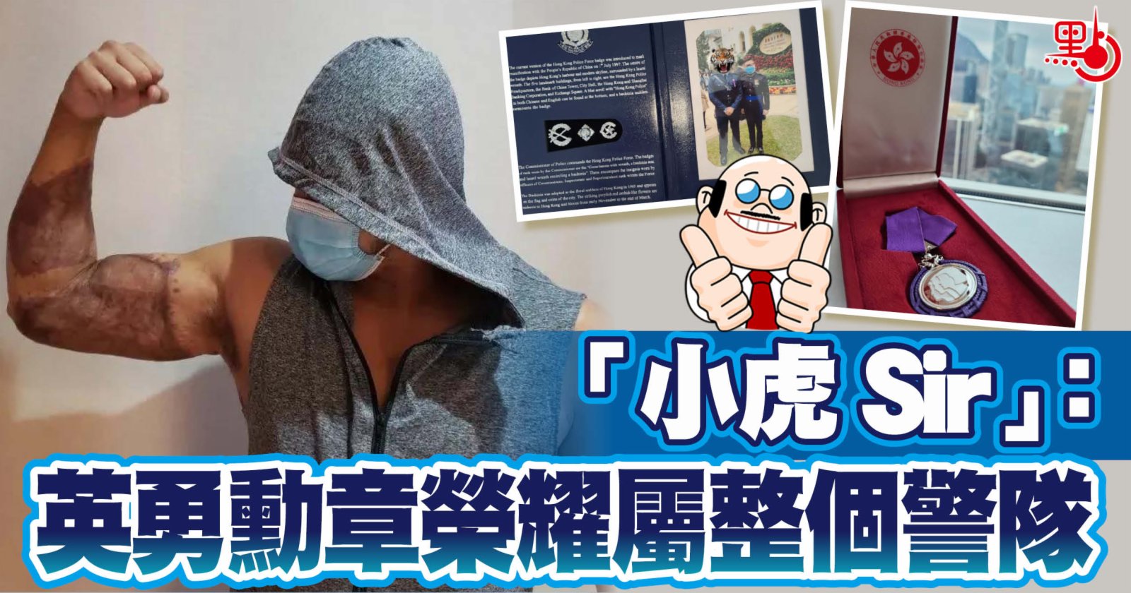 「小虎Sir」認為,在今次的授勳典禮,自己只是一位代領者,這枚勳章榮耀絕對是屬於整個香港警隊、絕對是屬於在這黑暴運動中一直輍出自己、堅持使命、守護香港的每一位同袍,而英勇榮譽稱號更是絕對值得冠以每一位香港警察身上!他相信「無論虎頭圖形背後是什麼樣子,都是香港警隊的一份子,依舊會履行職責,希望大家繼續支持我們香港警員!我堅信勝利只會遲來,但永遠不會缺席!」