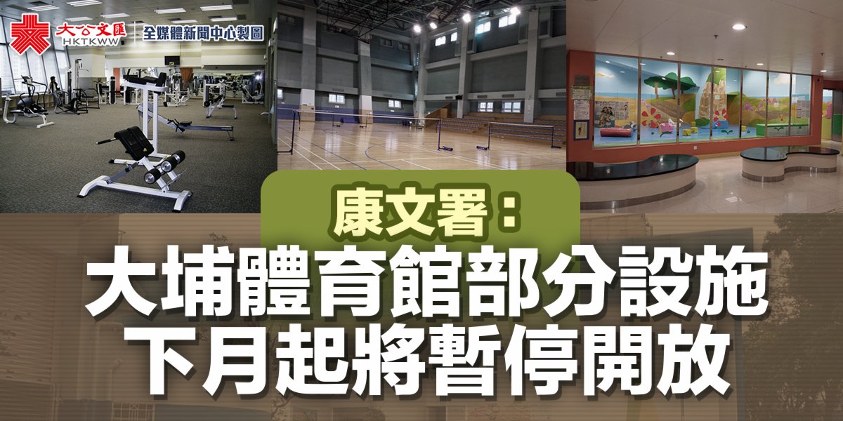大公文匯全媒體報道:康文署今日(19日)表示,大埔體育館的多用途主場因進行改善工程,下月起至明年6月10日將暫停開放。大埔運動場的草地足球場亦因進行草地保養工程,須於12月15日至28日暫停開放。