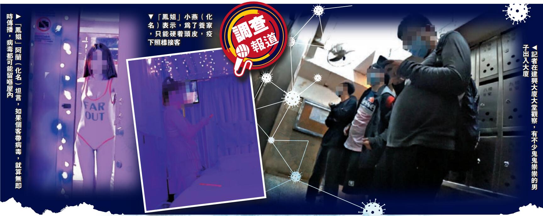 《大公報》前日揭發「黃色」經濟圈的防疫漏洞,一名在港賣淫女子確診新冠肺炎後,警方追蹤百名屬高危染疫群組的嫖客無果,恐有大量隱形病人在社區播毒。大公報記者昨日再走訪本港三大「鳳廈」包括富士大廈、建興大廈等,發現「鳳廈」的防疫情況堪虞,有醫生直指「鳳廈」屬於爆疫高風險區,建議有關當局增加社區檢測。有年約30歲的「鳳姐」向記者無奈表示,「點會唔擔心新冠肺炎,真係會死人㗎!」性工作者關注組織紫藤發言人李小姐表示,性工作者一向是被社會忽略的「隱形」社群,疫下為了餬口「驚都要做」,希望在疫苗面世前,政府能多作研究,有措施跟進。