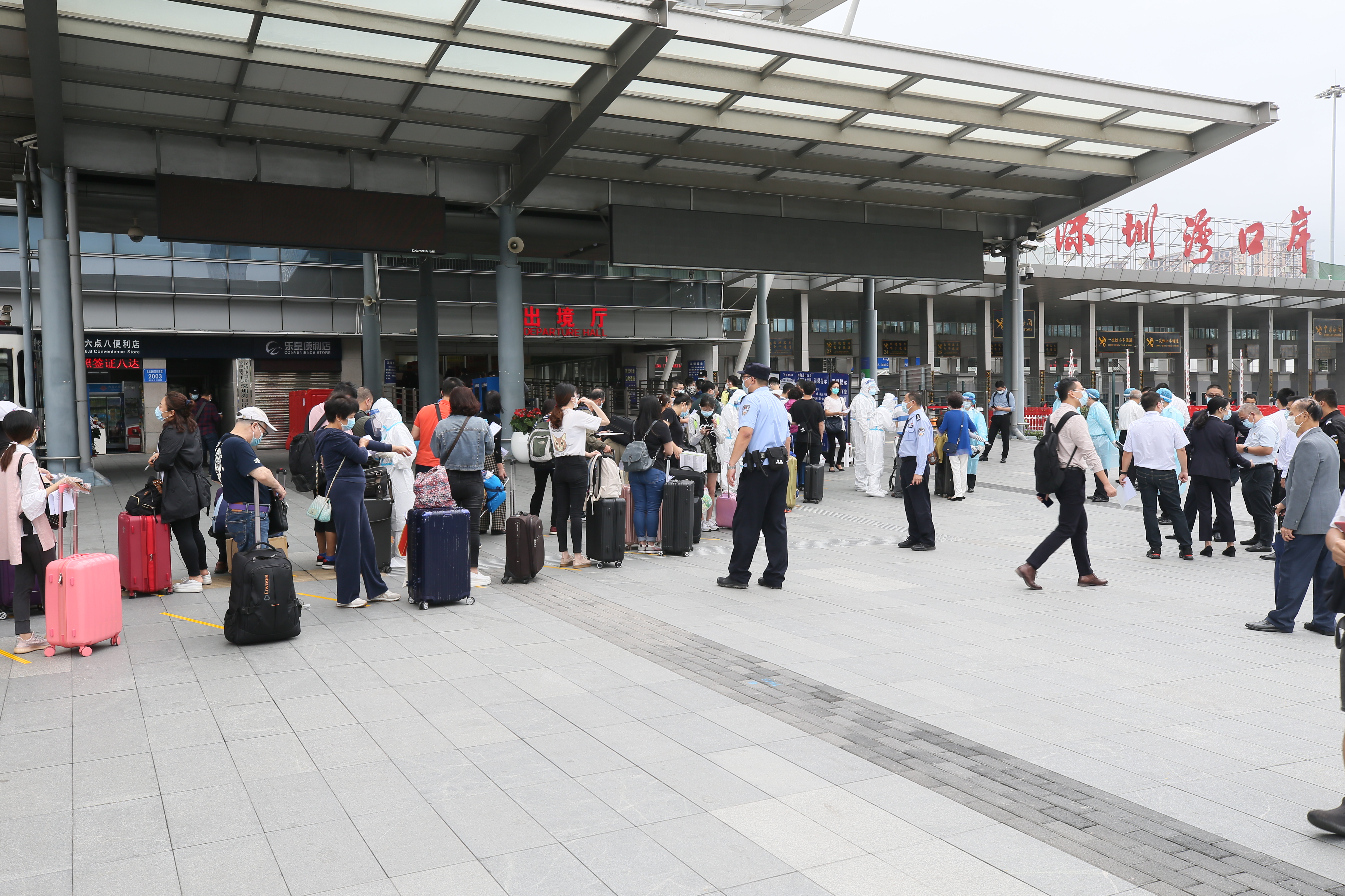 「請大家按照腳下的黃線標識間隔排好隊,並提前準備好通關證件和相關憑證。」上午10時,深圳灣口岸一開閘廣場上循環播放着協助港人通關的提示。拉着各式行李箱的出境旅客就快步前往旅檢大廳,由於口岸聯檢單位核對「回港易」人員條件的需要,加之旅客數量較多,候檢隊伍一度從出境斜坡一直延伸至口岸入口處。