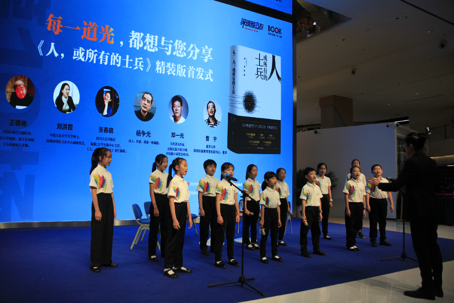 (香港文匯網記者 李望賢 深圳報道)「長亭外,古道邊,芳草碧連天……」24日晚,在深圳書城,由來自深圳音樂廳飛越彩虹多民族童聲合唱團13位小朋友帶來的一曲《送別》音樂快閃,吸引了不少觀眾,也為「每一道光都想與您分享——《人,或所有的士兵》精裝版首發式」拉開帷幕。著名評論家王春林、文學博士劉洪霞、著名編劇楊爭光、資深出版人張春曉及作者鄧一光,圍繞「戰爭與人」的關係,展開了精彩論述。