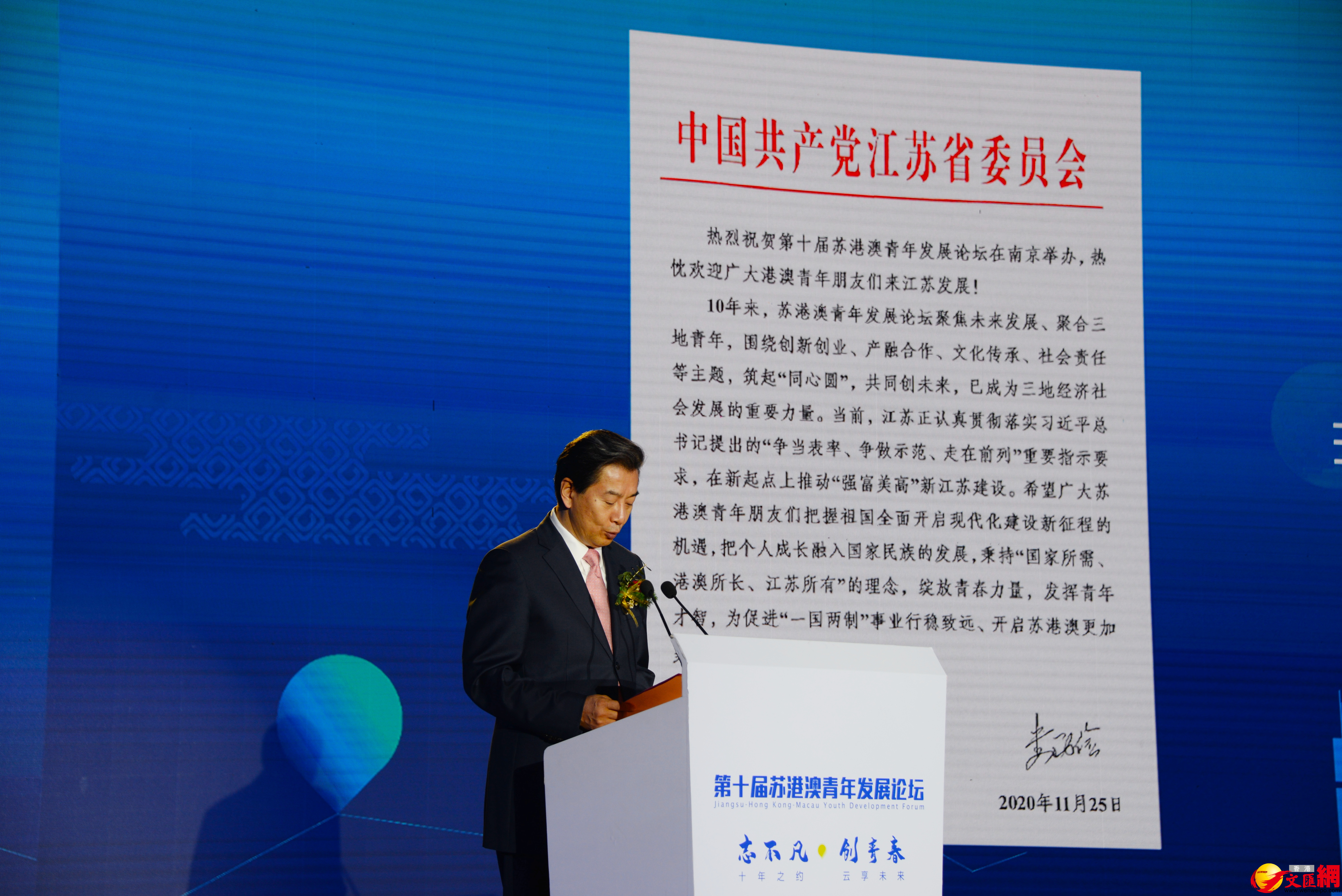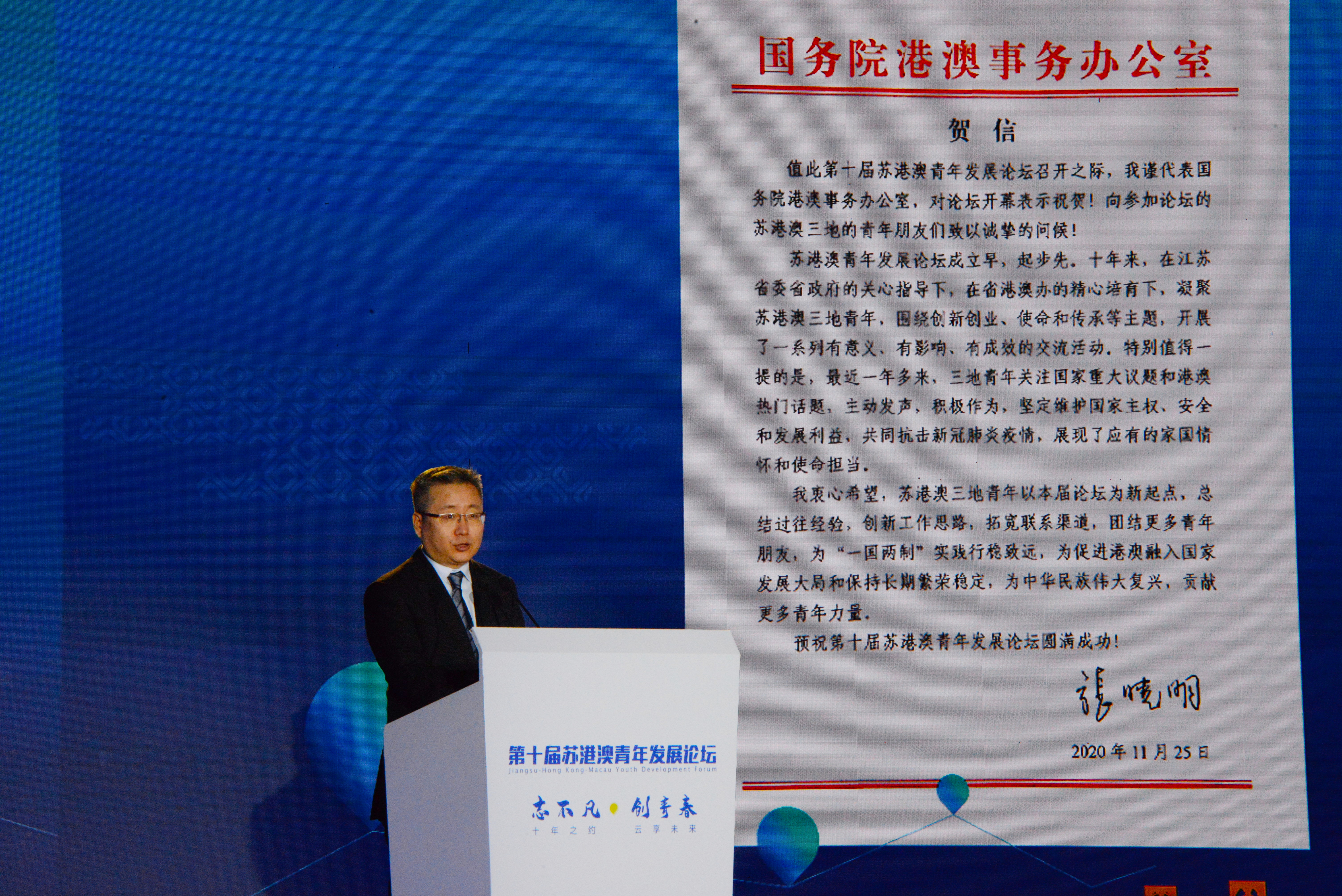 張曉明在賀信中表示,蘇港澳青年發展論壇成立早,起步先。十年來,在江蘇省委省政府的關心指導下,在省港澳辦的精心培育下,凝聚蘇港澳三地青年,圍繞創新創業、使命和傳承等主題,開展了一系列有意義、有影響、有成效的交流活動。最近一年多來,三地青年關注國家重大議題和港澳熱門話題,主動發聲,積極作為,堅定維護國家主權、安全和發展利益,共同抗擊新冠肺炎疫情,展現了應有的家國情懷和使命擔當。