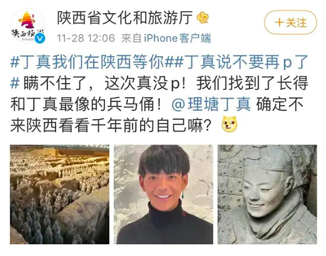 丁真紅了,各省文旅官博為帶動當地旅遊,紛紛開始「搶人」。「好客」山東、「湘」當美的湖南、「好地方」新疆、「詩畫」浙江、「攀親戚」的雲南,還有找到「最像丁真兵馬俑」的陝西,甚至丹麥、挪威等國際隊也下場開搶了。其中,最有競爭力的搶奪者當屬西藏,尤其是當丁真在某次採訪中說出「最想去拉薩」之後,網友們自然而然將一身藏族打扮的小夥納入了西藏體系。川臧兩地官博互動頻繁,P圖搶奪大戰歡樂多多。一條條生動的微博里,彷彿置身大型旅遊推介會,為疫情阻斷的旅遊市場添上了一縷明媚的色彩。