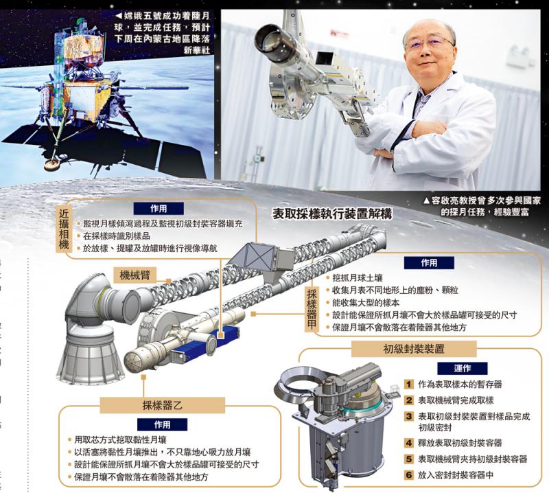 (大公報記者 湯嘉平)嫦娥五號已於12月1日在月球表面軟着陸,當中理工大學研發的「表取採樣執行裝置」在同日完成了全自動的表土採樣及封裝任務,樣本多達兩公斤。正所謂「台上一分鐘,台下十年功」,負責研發相關裝置的理大教授容啟亮昨日在記者會上表示,該套裝置已研發七年,需要克服耐熱、無潤滑劑情況下的運作等高難度要求,今次的成功離不開之前的努力。據悉,載有月壤樣本的飛行器目前正返回地球,預計下周在內蒙古地區降落。這次是繼「火星相機」後,容啟亮再次帶領團隊參與國家太空任務。