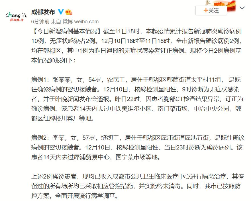 12月11日晚上9點,成都市人民政府新聞辦公室舉行專題發布會,對郫都區新冠肺炎確診病例進行最新情況通報。市衞健委主任謝強介紹,截至12月11日晚6時,全市新報告確診病例2例,均在郫都區,其中1例為無症狀感染者訂正病例。