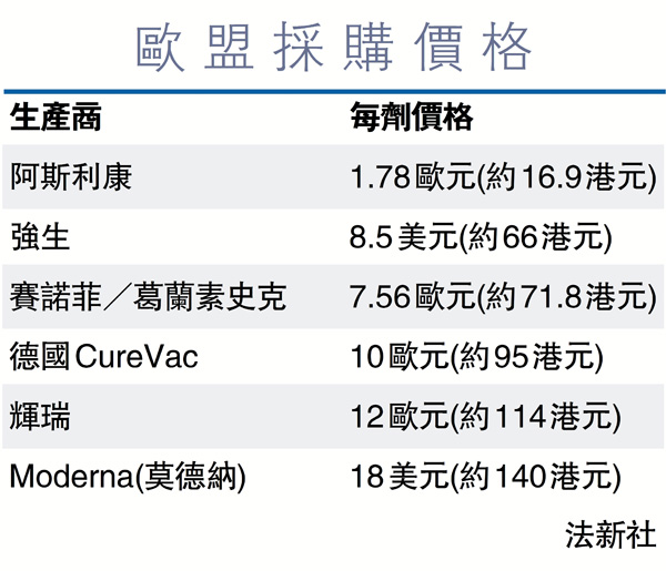 比利時政府一名官員昨日不慎在twitter上,公布歐盟向不同藥廠採購新冠疫苗的價格,當中最便宜的是英國牛津大學與阿斯利康藥廠合研的疫苗,每劑只需1.78歐元(約16.9港元);最貴則是美國藥廠Moderna(莫德納)的疫苗,每劑要18美元(約140港元)。