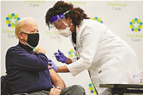 拜登戴上兩層口罩,在電視直播下接種輝瑞的新冠疫苗,他在打針後稱「沒什麼值得擔心,我這樣做是為了表明,人們應該在可以接種疫苗的時候做好準備。」但他強調這只是開端,在遏制病毒傳播上還有漫漫長路,希望民眾遵照專家建議,繼續戴口罩及避免不必要出行。