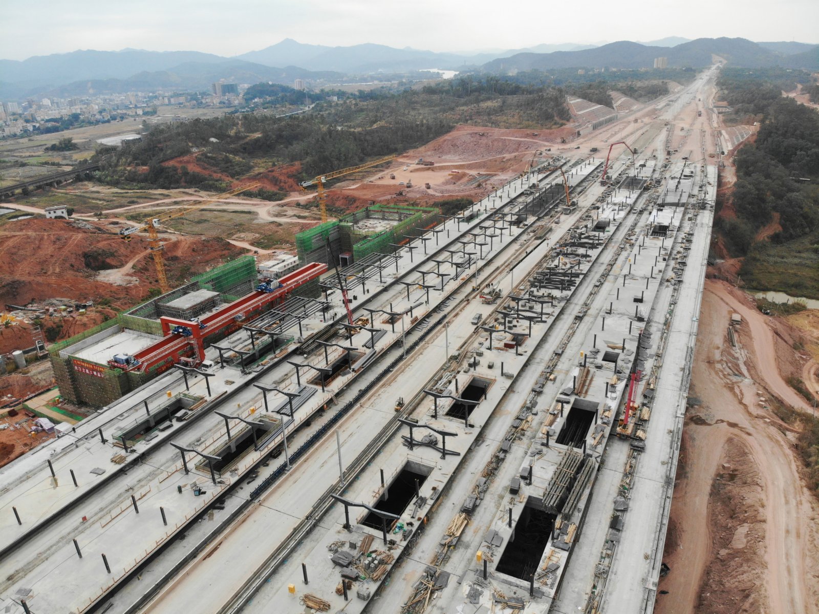 其中,作為廣東河源段內最大站點的龍川西站,設計為高架站,共設4站台12股道。據設計規劃,龍川西站還將作為贛深高鐵與梅龍、廣河高鐵的交會站,開通運營後將成為連接粵港澳大灣區與中原城市群、長三角地區線路上的一個高速鐵路樞紐。隨着該站橋樑主體工程完工,河源段建設進入新階段,目前龍川西站無砟軌道及車站站房施工正在加快推進。