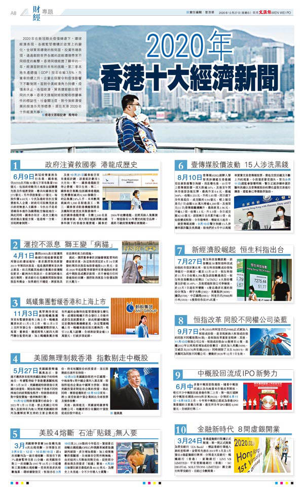 2020年在新冠肺炎疫情肆虐下,環球經濟表現、各國監管機構於政策上的變化,全球貿易環境的新局面,投資市場表現,通通都對世界各國的政經環境帶來不同程度的衝擊。香港同樣經歷了艱辛的一年,經濟面對前所未有的挑戰,第三季本地生產總值(GDP)按年收縮3.5%,失業率持續上升,企業在限聚令和疫情影響下不斷倒閉。面對中美經濟角力持續,疫情未休止,各個經濟、貿易環節都出現不同的大事。香港文匯報財經新聞部根據事件的標誌性、社會關注度、對今後經濟發展的推進作用等標準,選出本港 2020年十件經濟大事。