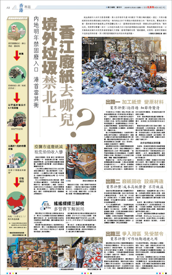 香港文匯報本周一(12月28日)刊登專題文章探討了多個解決方案,有回收業界擔憂本港將廢紙圍城,認為將廢紙加工為紙漿成為「原材料」進口內地,是其中一個解決辦法。事實上,政府2018年底已批出屯門環保園近兩公頃用地予一間公司建設造紙廠,惟傳出該公司因成本過高決定退標,政府因此會重新招標改為設立紙漿廠。