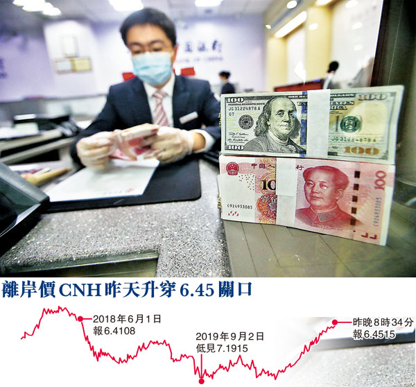 人民幣昨走勢強勁,離岸CNH昨早市已升穿6.45關口,此後接連突破6.49、6.48、6.47和6.46水平,於下午兩時高見6.4401的高位。在岸CNY亦造好,早市已升500餘點,午後進一步走強,下午近5時曾高見6.4587。截至昨晚7時,離岸價報6.4460,在岸價報6.4628,分別較上個交易日升逾500點子及逾600點子。