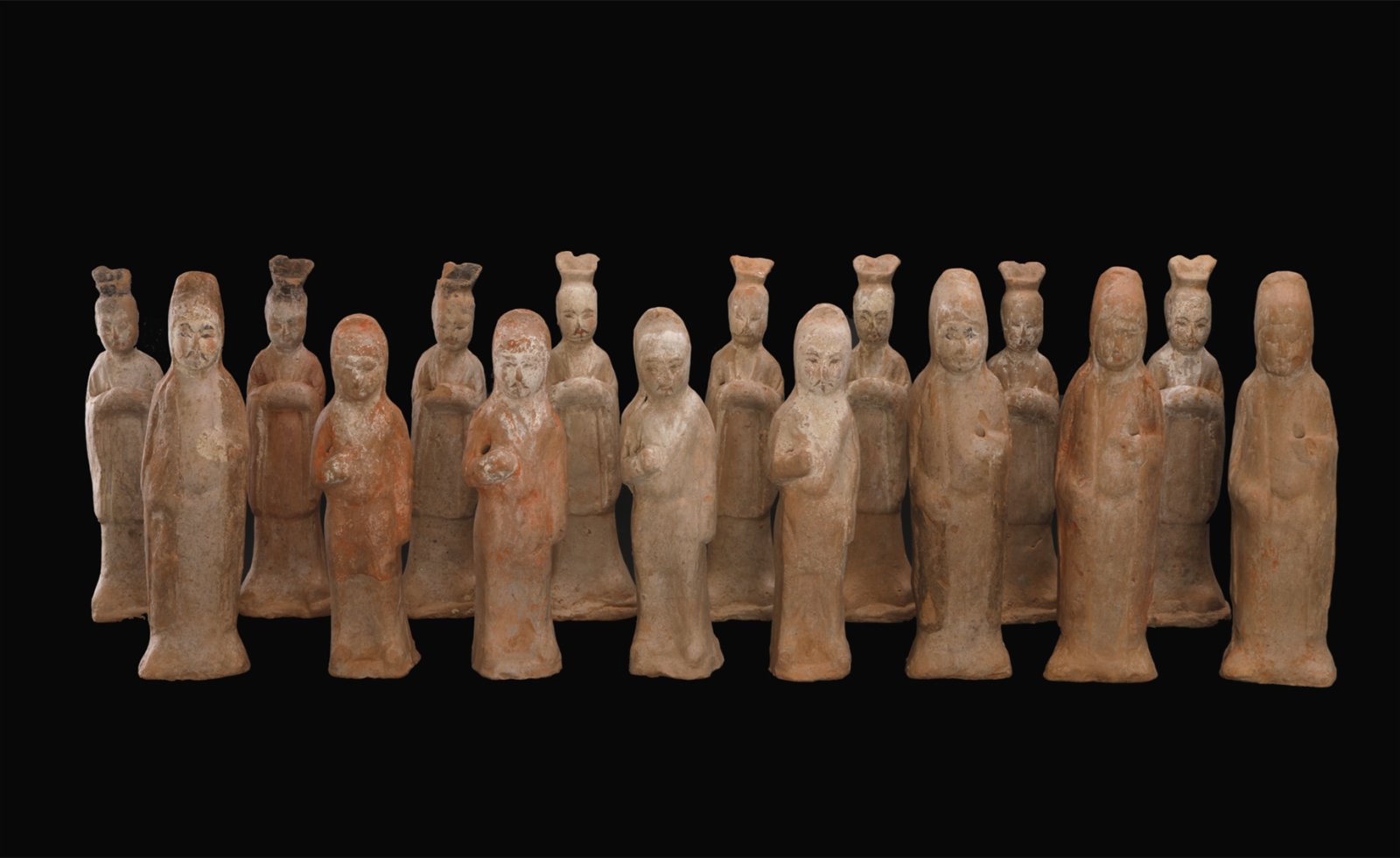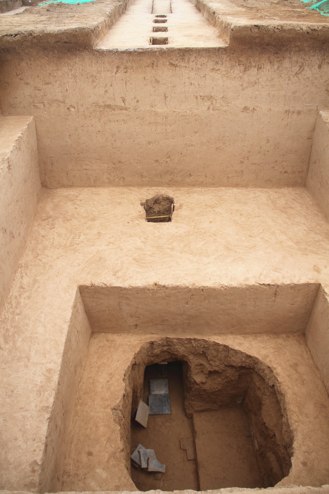 此次發掘的編號為M13的唐墓是一座帶有圍溝兆域和封土的5天井單室磚券墓,墓葬南北水準總長42.5米,由斜坡墓道、5個過洞、5個天井、4個壁龕、甬道和墓室組成。墓室為明壙磚券,穹隆頂已坍塌,墓葬內共出土各類隨葬遺物102件(組),多為放置在壁龕內的騎馬俑和立俑。