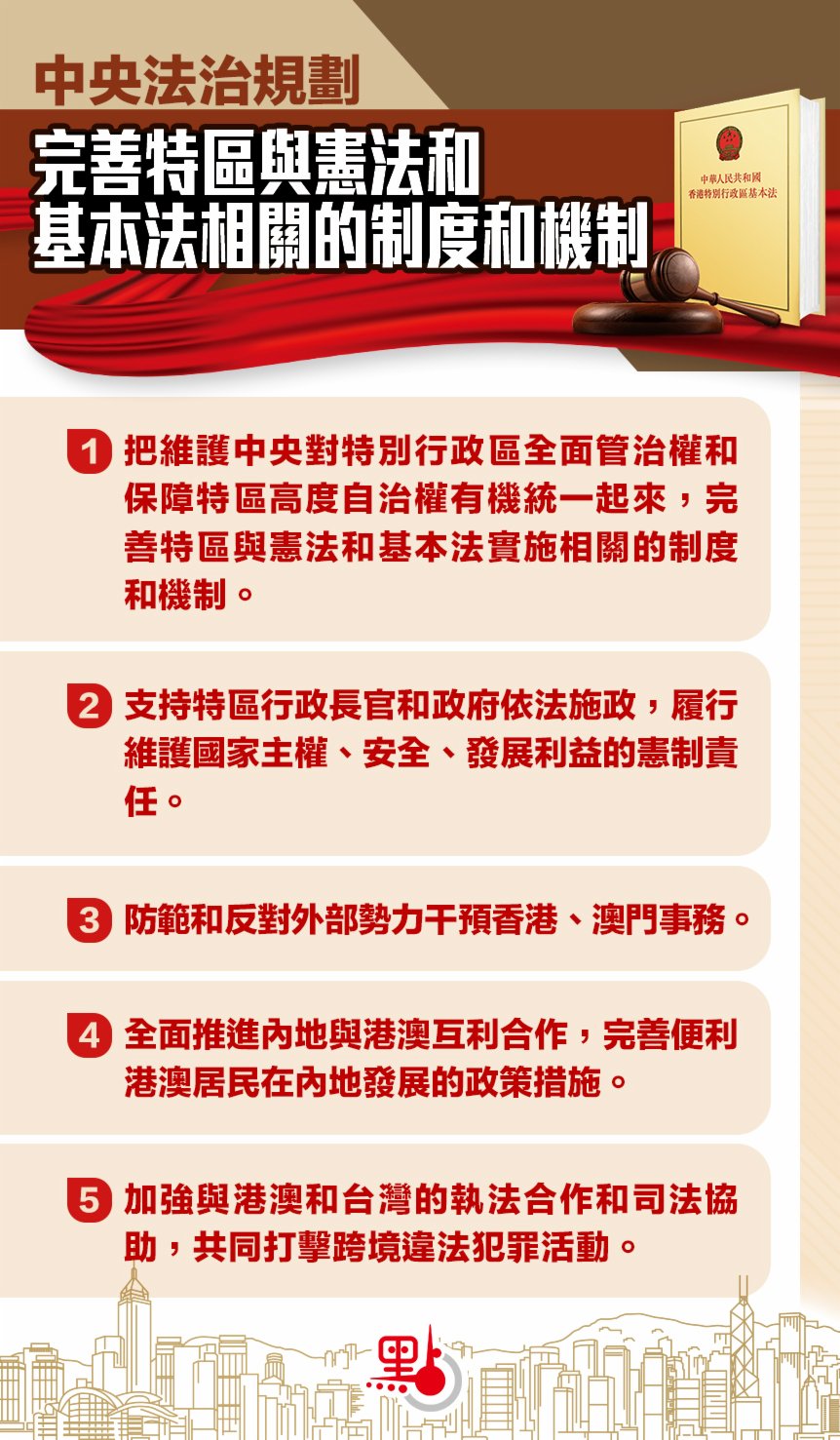 大公文匯全媒體報道:中共中央近日印發未來5年的《法治中國建設規劃》(下稱規劃),強調依法維護國家主權、安全和發展利益的部分,提到要依法保障「一國兩制」,貫徹「港人治港」、「澳人治澳」、高度自治方針,把維護中央對特別行政區全面管治權和保障特區高度自治權有機統一起來,完善特區與憲法和基本法實施相關的制度和機制。支持特區行政長官和政府依法施政,履行維護國家主權、安全、發展利益的憲制責任。防範和反對外部勢力干預香港、澳門事務。規劃又要求全面推進內地與港澳互利合作,完善便利港澳居民在內地發展的政策措施。加強與港澳和台灣的執法合作和司法協助,共同打擊跨境違法犯罪活動。