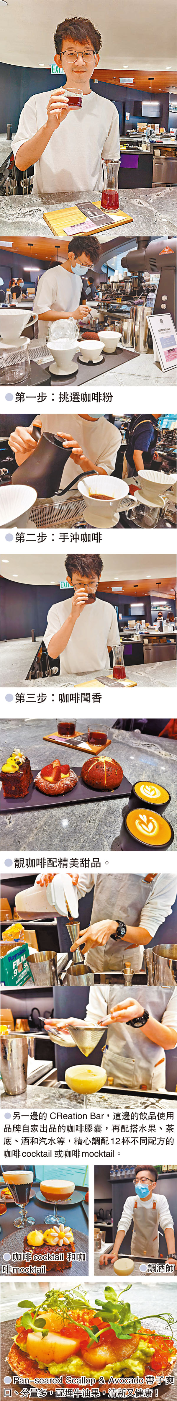 另一邊的CReation Bar,這邊的飲品使用品牌自家出品的咖啡膠囊,再配搭水果、茶底、酒和汽水等,精心調配12杯不同配方的咖啡cocktail 或咖啡mocktail。為方便時下白領解決午餐問題,這裏還有Open-face三文治、Smoke & Barrels、兩款特色意粉蛋糕甜品,同樣好滋味,是OL和行政人員的中午好地方。吃完正餐還可以嘆這個La Vina甜品和咖啡調酒!