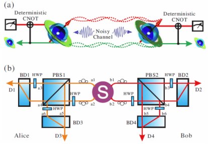 量子中繼是在噪聲信道中實現長距離量子通信的重要途徑,而量子糾纏純化是量子中繼中的關鍵操作,利用量子糾纏純化操作可以從兩份糾纏度較低的糾纏態中提煉出一份糾纏度較高的糾纏態。此前的糾纏純化協議都是利用兩對低糾纏度的光子對實現,中國科大研究團隊與合作者提出僅需一對超糾纏光子對的糾纏純化方案。