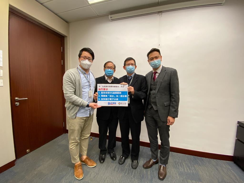立法會議員周浩鼎表示,在疫情打擊下,整體經濟環境轉差,不少打工仔朝不保夕,希望水務署能酌情處理水費事宜。屯門及元朗團隊亦在會上反映區內街坊的問題,包括獨居長者一向長時間在家,未必因疫情而增加耗水量;水務署熱線電話沒人接聽;用食水沖廁的單位,有否被錯估用水量等。
