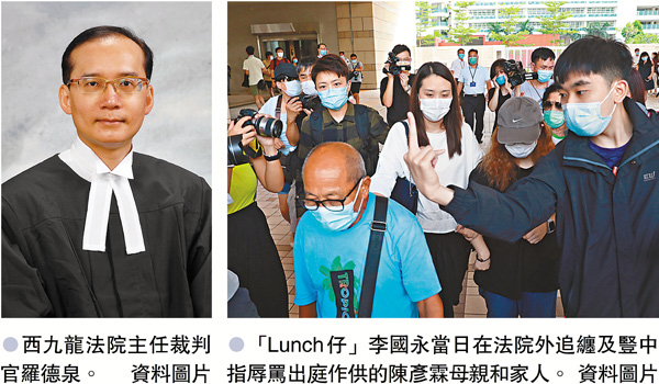兩名被告分別為人稱「Lunch仔」的中六男生李國永(17歲),以及退休女保安員賴瑞英(65歲)。兩人原被控一項「公眾地方擾亂秩序行為」罪, 指兩人於去年8月24日在西九龍裁判法院大樓A座外作出擾亂秩序的行為,或作出帶有威嚇性、侮辱性或挑撥性的行為,意圖導致或相當可能導致任何人合理地害怕等。