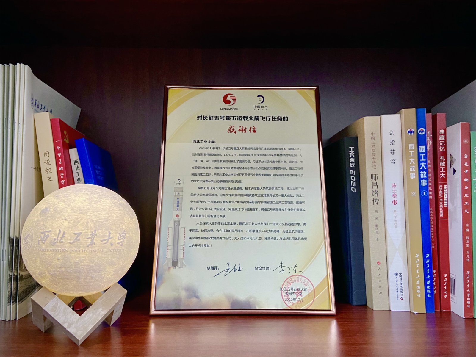 (香港文匯網記者 李陽波 西安報道)「向西北工業大學對長征五號遙五火箭發射嫦娥五號探測器任務過程中給予的大力支持……」近日,西北工業大學收到了「長征五號運載火箭型號辦公室」發來的一封特殊的感謝信,長征五號運載火箭總指揮王珏和總設計師李東,在信中不僅充分肯定了該校為長征五號系列火箭配套生產的各類複雜形面零件「精密加工生產工藝穩定、質量可靠」,同時也向他們參與並圓滿完成我國首次地外天體採樣任務,表示了衷心的感謝和崇高的敬意。西北工業大學也是在我國新一代運載液氧煤油發動機研發領域中,唯一收到本次任務感謝信的高校。