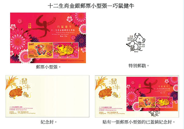 至於以「巧鼠健牛」為題的十二生肖金銀郵票小型張,根據郵局介紹,今年用上了桃紅色背景,以較為炫目的圖案拼湊出花團錦簇的景象,同時在票面上嵌以銀箔燙印而成的「歲次庚子(鼠年)」郵票及以22K鍍金金片製成的「歲次辛丑(牛年)」郵票,面值各50元,並附有黃金成色證明書,以供各集郵愛好者珍藏之用。