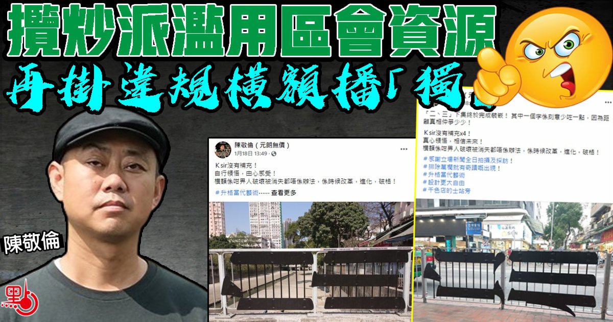 大公文匯全媒體報道:攬炒派濫用公共資源,利用區議會平台播「獨」!元朗區議員陳敬倫早前用木板、鐵線等喺欄杆紮「banner」,打橫睇可看出「自由」二字。噚日又在獻新猶,喺fb出帖話「『二丶三』下集終於完成裝嵌! 其中一個字係刻意少咗一點,因為距離真相仲爭少少!」,而打橫睇就會看出類似「真相」二字,他續辯稱是「裝置藝術」云云,更揚言未來陸有「新作」推出㖭。