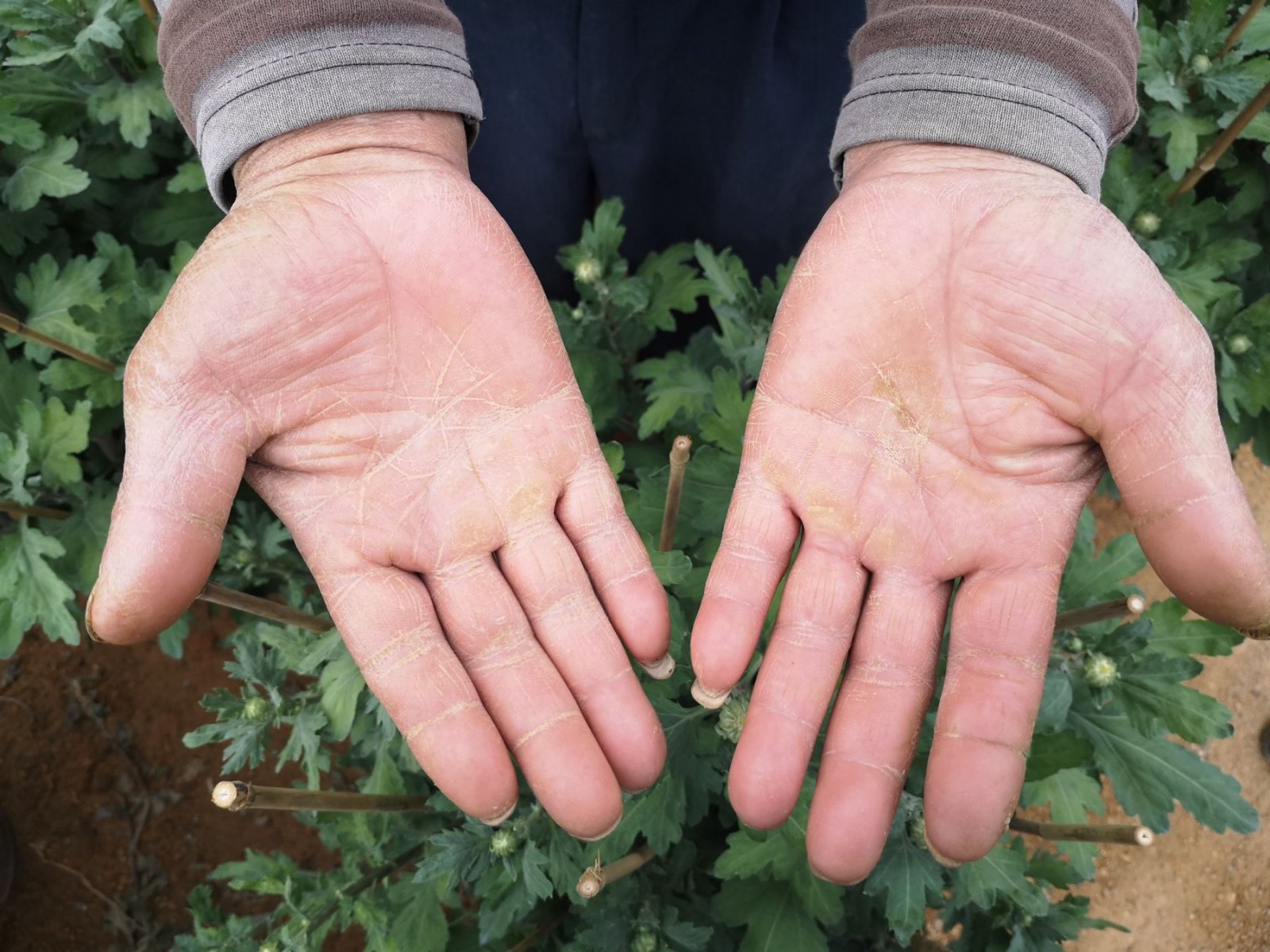 苦樂皆是養花人。李昌嚴和工人的手上布滿老繭,多年的勞作,讓李昌嚴的手指格外的粗壯。據李昌嚴介紹,一盆花批發給港商為50元人民幣,其中成本就要35元,此外還要負擔人工和場地費,其實一盆花只賺幾元錢,但是對花的喜愛讓他無法釋懷。