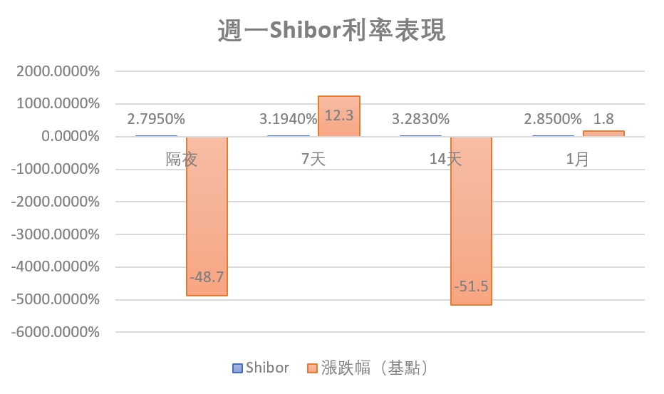 得益於今日央行對流動性的補充,隔夜和跨節的14天期回購利率資金價格開始回落。數據顯示,周一上海銀行間同業拆放市場(Shibor)各短期品種回購利率「漲跌互見」。具體看,隔夜利率回落48.7個基點,至2.795%;7天期回購利率上漲12.3個基點,至3.194%;14天期回購利率下跌51.5個基點,至3.283%;1月期回購利率微升1.8個基點,至2.85%。