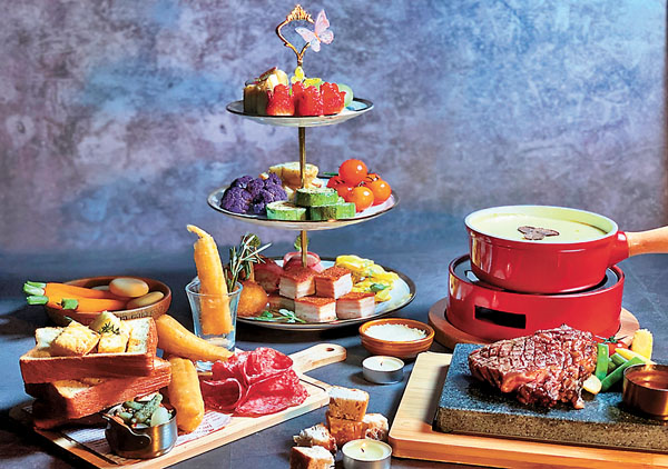 黑松露芝士火鍋套餐選用了瑞士告老也及艾文達芝士,且調校出恰到好處的芝士濃稠度,再灑上新鮮即刨的黑松露,陣陣菌香融入幼滑濃郁的芝士醬,芝味濃厚令人無法抗拒!值得推介的是皮脆肉嫩的燒豬腩蘸上拉絲芝士,口感出色滿有驚喜。豐富配料有丹麥多士、中式炸油條、意大利沙樂美腸、意大利雲吞、金香雞鎚、煙肉帶子卷,以及新鮮生果和薯粒等。主菜方面,當然不能錯過肉量十足的「美國頂級肉眼牛扒配粉紅胡椒汁」或較輕盈的「慢焗鱸魚配羅勒番茄汁」,用料和烹煮方法更是十分吸引,適合情侶們度過情意綿綿的一晚。