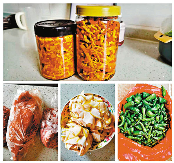 朱艷說,當她打開快遞箱時都驚呆了,「我媽把整個菜市場都寄了過來。」從媽媽親手醃製的柚子皮、鹹菜、雪裏蕻,到現宰的牛肉、豬肉,新鮮水靈的藜蒿,再到她愛吃的乾筍、臘肉,以及隔一段時間不吃就會無比想念的家鄉名菜「豐收辣椒」,另外還有幾根蓮藕。「我媽特別可愛,寄快遞那天原本想着去菜市場再買一些新鮮蓮藕,但快遞員提前到了,她就趕緊把準備中午吃的蓮藕給我塞到了快遞箱裏。」
