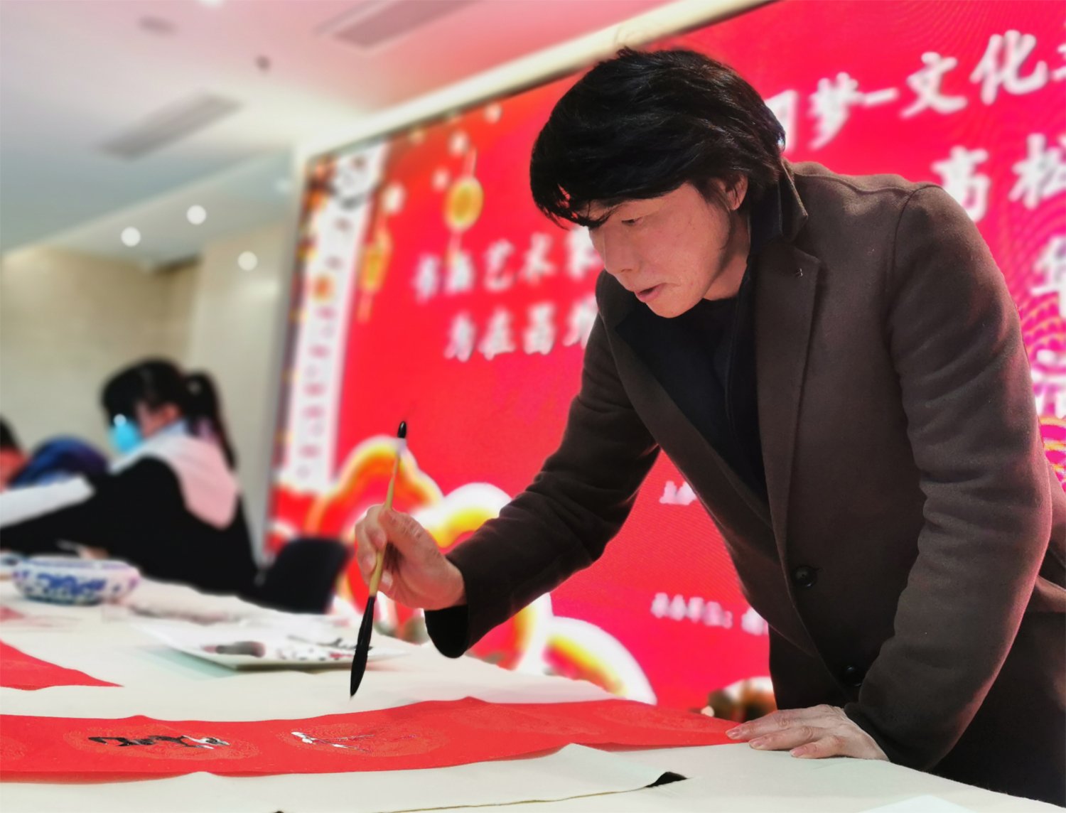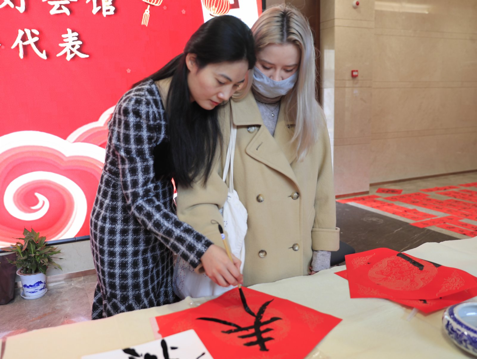 贛籍海外藝術家熊峰一早便帶領學生們前來揮毫潑墨,在紅紙上寫下新春祝福。他說:「貼春聯是中華民族的傳統習俗,人們喜歡用春聯來寄託美好願景。今天的活動不僅讓外國朋友們感受到中國春節的喜慶,也讓我想起了早年旅日時光,華人朋友們每逢春節就會聚在一起寫春聯、吃團圓飯。由於疫情,我去年至今一直待在國內,還教幾個學生練書法,要讓年輕一代了解傳承民族傳統文化的重要性。」