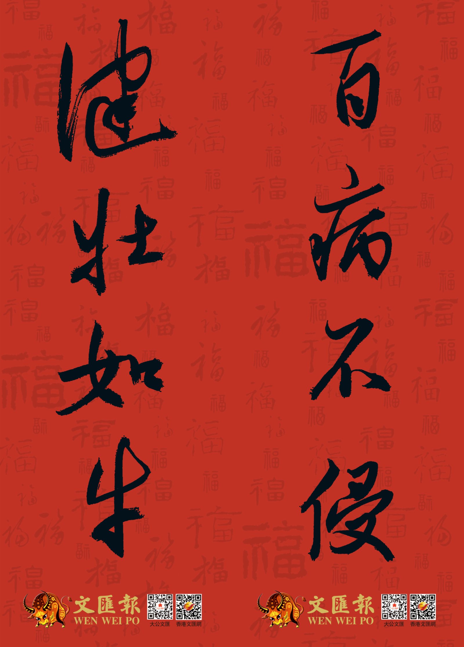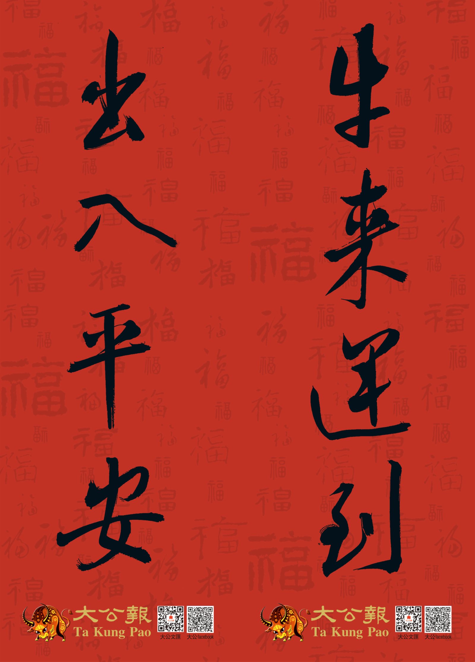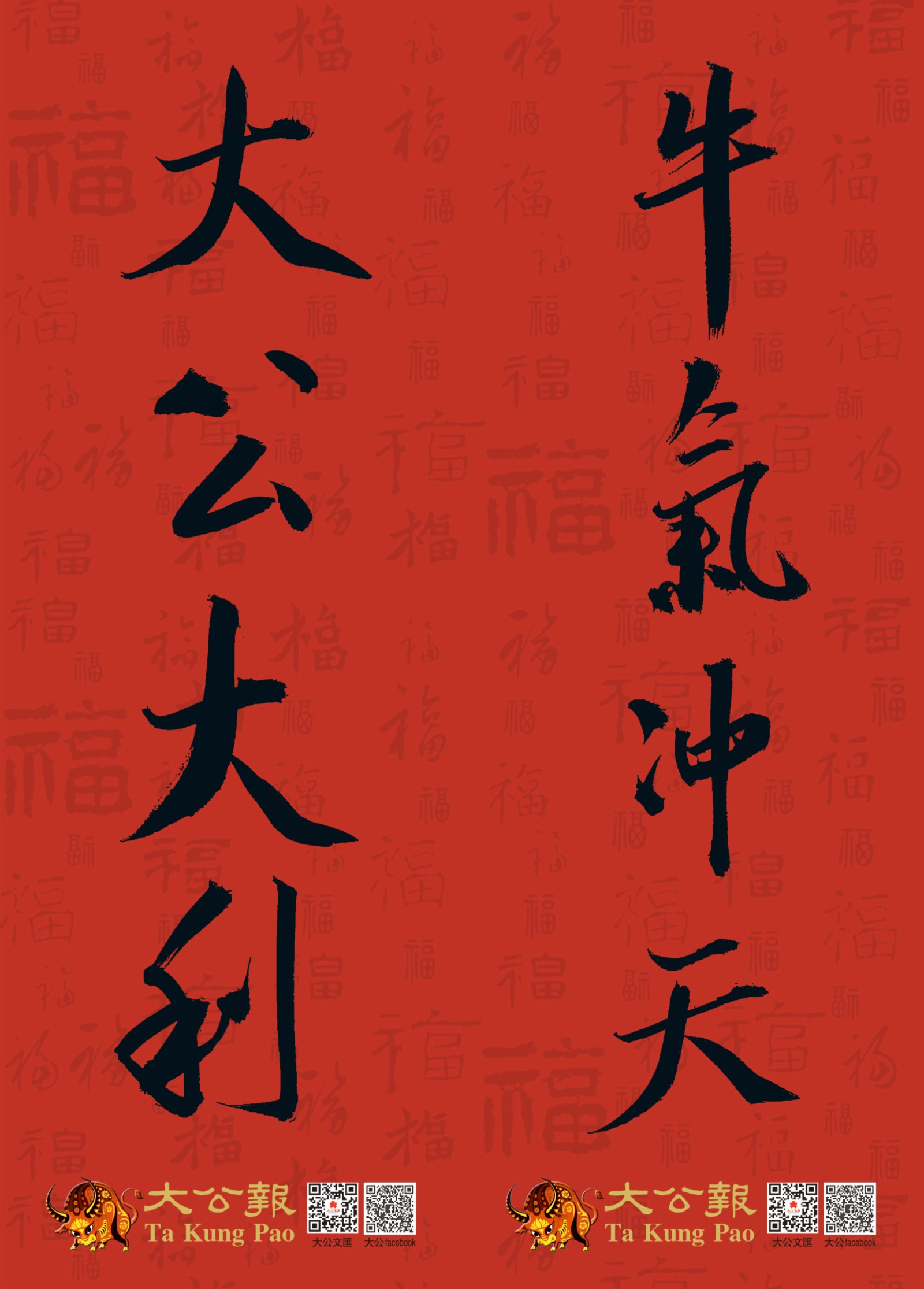 揮春的祝福語包括「國安家好 春來福到」「百病不侵 健壯如牛」「牛來運到 出入平安」「牛氣沖天 大公大利」等(如圖),表達對香港由亂向治、戰勝疫情、更加美好的期盼,對讀者身體健康、家庭幸福、萬事勝意的祝福。
