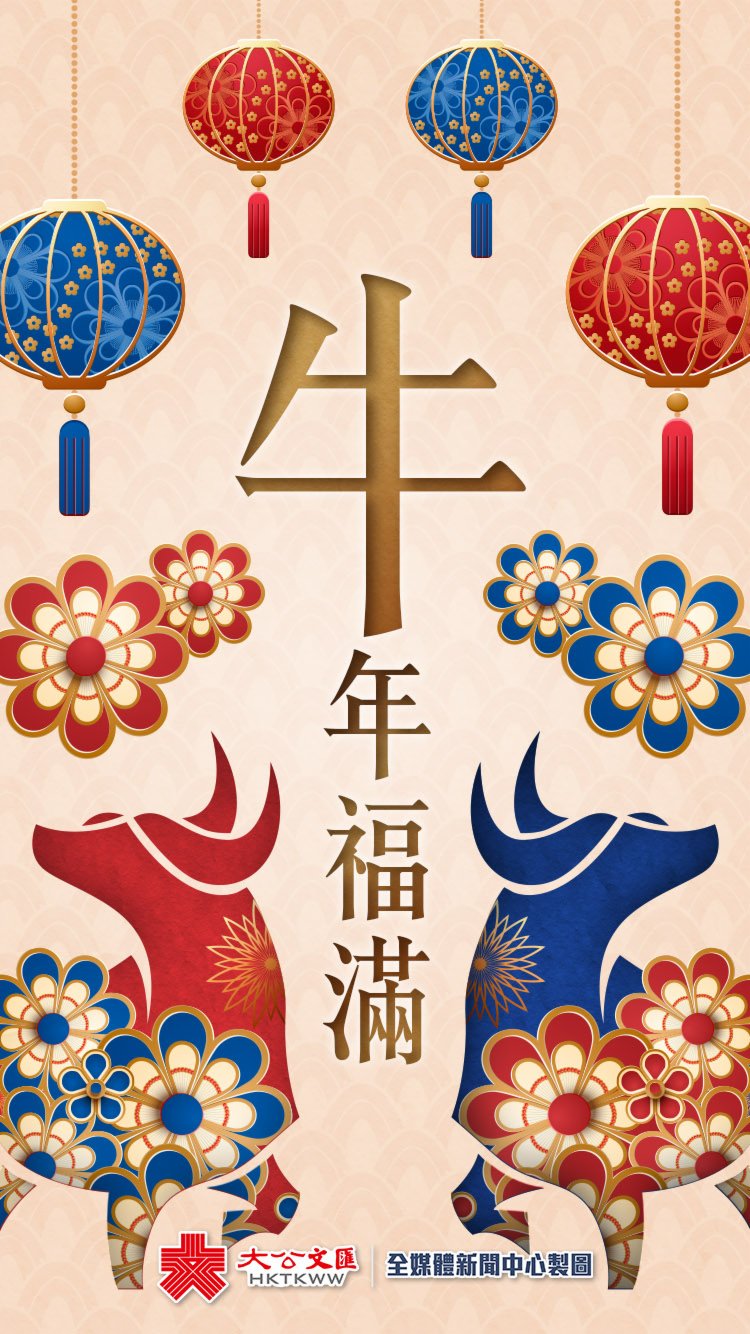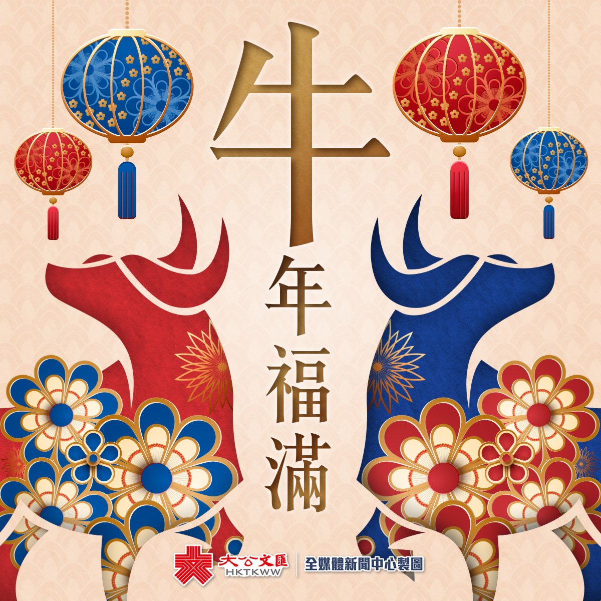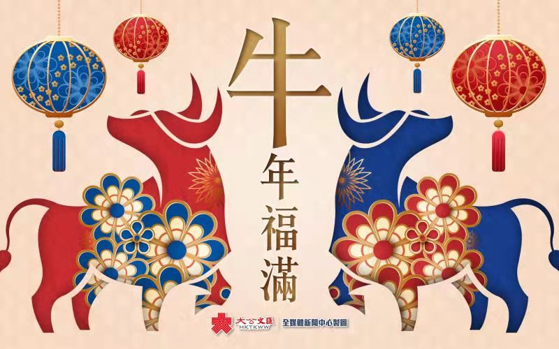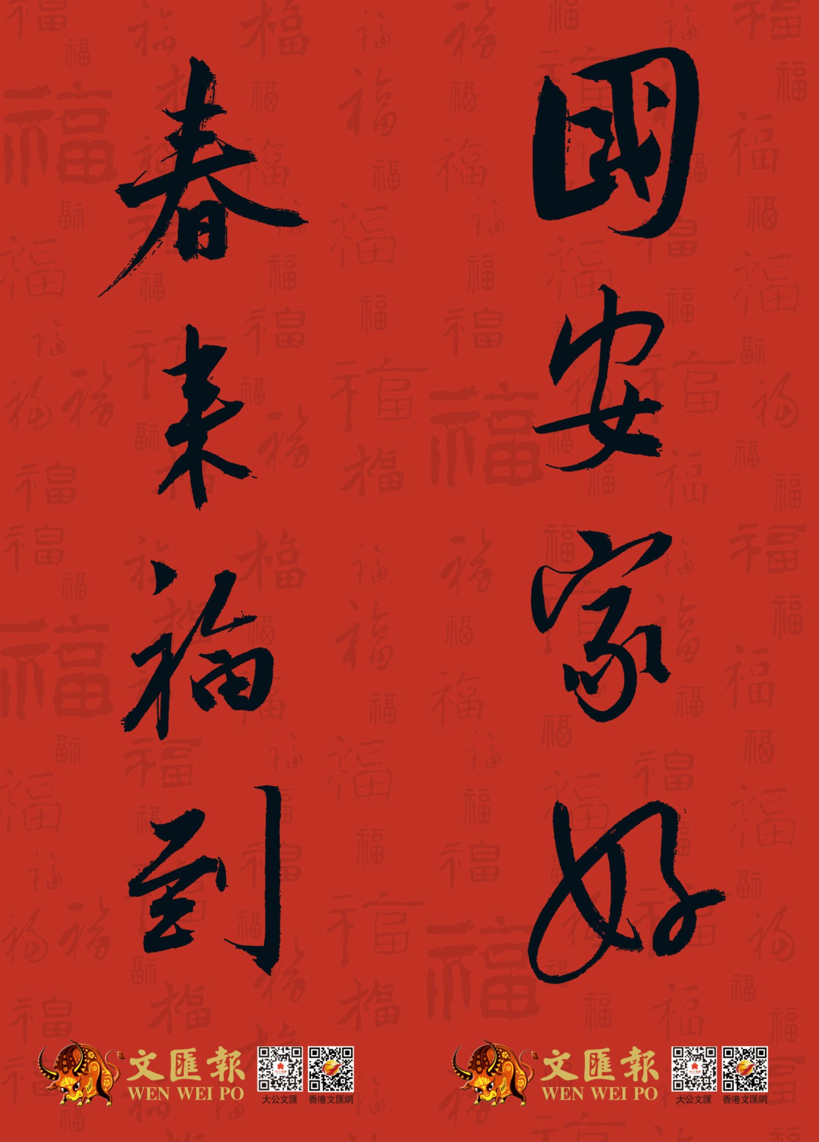 揮春的祝福語包括「國安家好 春來福到」「百病不侵 健壯如牛」「牛來運到 出入平安」「牛氣沖天 大公大利」等(如圖),表達對香港由亂向治、戰勝疫情、更加美好的期盼,對讀者身體健康、家庭幸福、萬事勝意的祝福。
