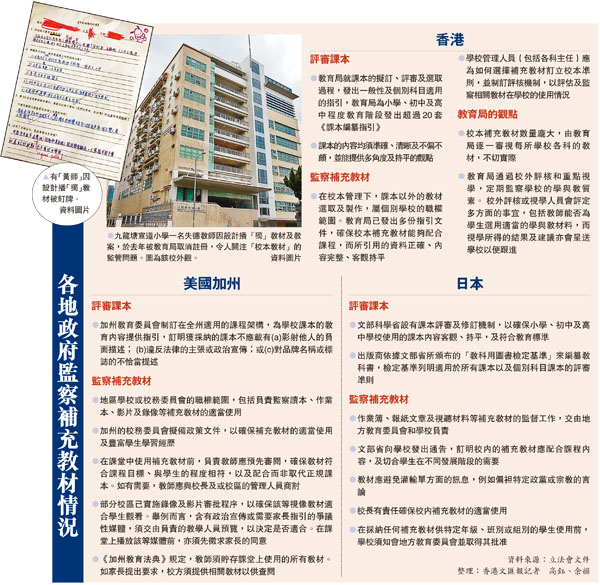 就其他國家及地區的政府如何處理補充教材的監管問題,立法會近日完成了《選定地方監察學校課本及補充教材的機制》研究報告,當中提及,在美國加州及日本,補充教材既屬學校職權範圍,亦會同時受地方層面的教育委員會監督。以加州為例,地區學校或校務委員會的職權範圍包括負責監察讀本、作業本、影片及錄像等補充教材的適當使用。部分校區已實施錄像及影片審批程序,確保相關影視教材適合學生觀看,含有政治宣傳等的爭議性媒體,須交由負責的教學人員預覽;在課堂上播放該媒體前,亦要先徵求家長同意。