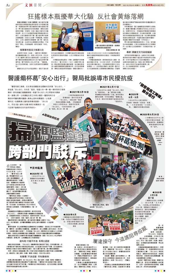 「醫管局員工陣線」在全港各區擺設街站煽動市民杯葛「安心出行」,更造謠「安心出行」目的是「監控」每個人的一舉一動。創科局昨日發表聲明,對有組織打着醫護旗號,就着「安心出行」向公眾發布失實資訊,誤導公眾,公然擾亂抗疫工作表示憤怒。醫管局同日在聲明中呼籲有關的醫護人員停止發布有關資訊,以免誤導市民。私隱專員公署則發表聲明強調,「安心出行」符合《個人資料(私隱)條例》有關要求,出行記錄不會備存在任何政府系統內。
