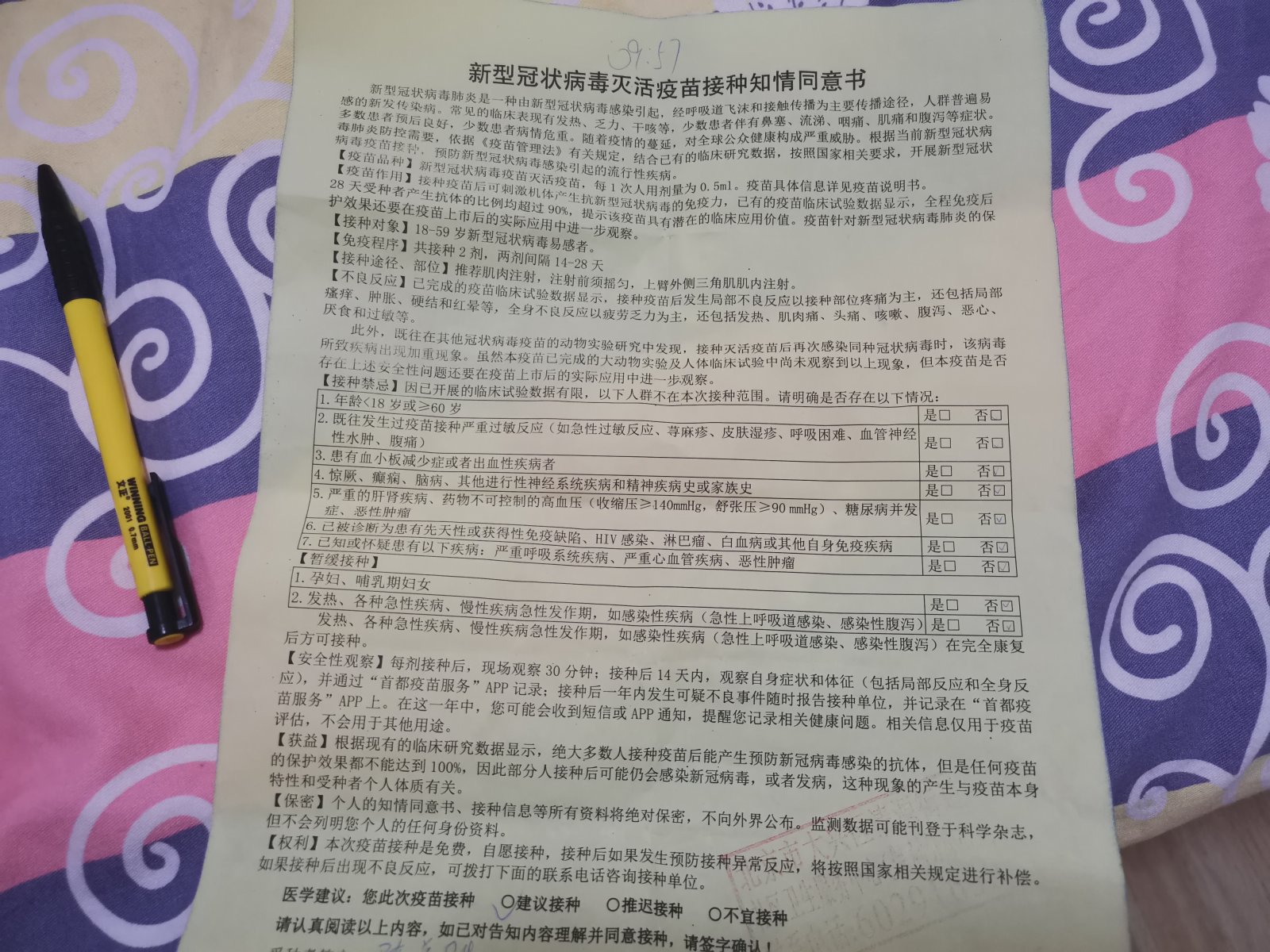 身為北京一家物流企業的員工,陳先生已完成全部2劑疫苗的接種,「單位在通知接種疫苗時詳細提醒了各種禁忌,包括不要空腹接種、發熱不能接種等,在接種前我也認真看了新冠疫苗接種知情同意書,上面對接種注意事項說得很詳細。除了剛接種完那幾天覺得有點疲乏,沒有其他不適感覺。」