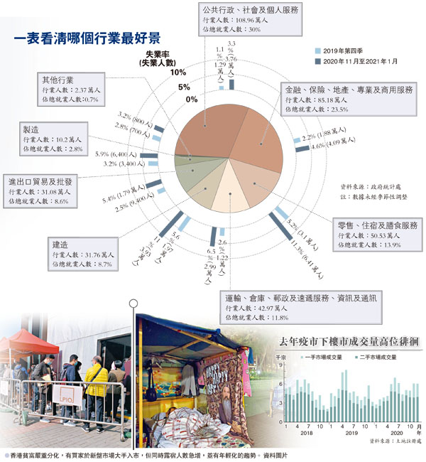 (香港文匯報記者 顏倫樂)本港最新失業率升至7%,見近17年新高,高過2008年金融海嘯時的5.5%;GDP連續6季收縮,去年全年收縮6.1%,但樓市去年全年僅橫行,甚至每當疫情緩和時,交投及樓價即反彈,新盤不乏連買多個單位的大手成交。這種經濟差、樓市旺的現象,正是香港貧富嚴重分化下的殘酷真相:失業人士集中在零售、旅遊等行業,大多屬基層,基本與私樓市場絕緣;反觀金融、地產行業受疫情影響小,更受惠全球放水下資產價格暴升,富者愈富,他們才是樓市的主力。香港同一天空下,人卻活在兩個不同的世界。