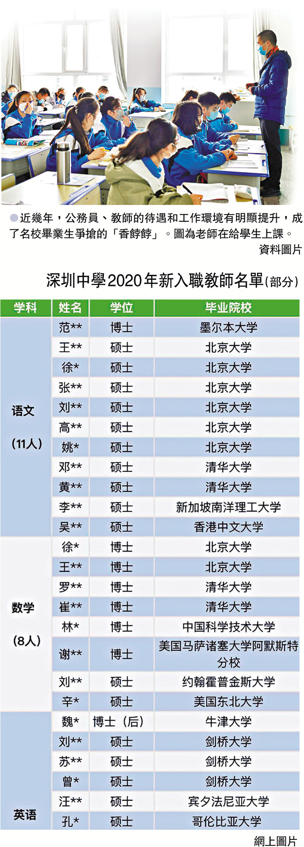 在廣州、深圳,多所中小學公布的招聘名單幾乎是清一色「清北」畢業生。深圳市南山外國語學校2020年小學、初高中老師錄用名單中,42名教師,17人來自北京大學,14人來自清華大學,4人來自香港高校,包括香港大學、香港理工大學、香港中文大學,另外,還有4人來自英國和美國名校。