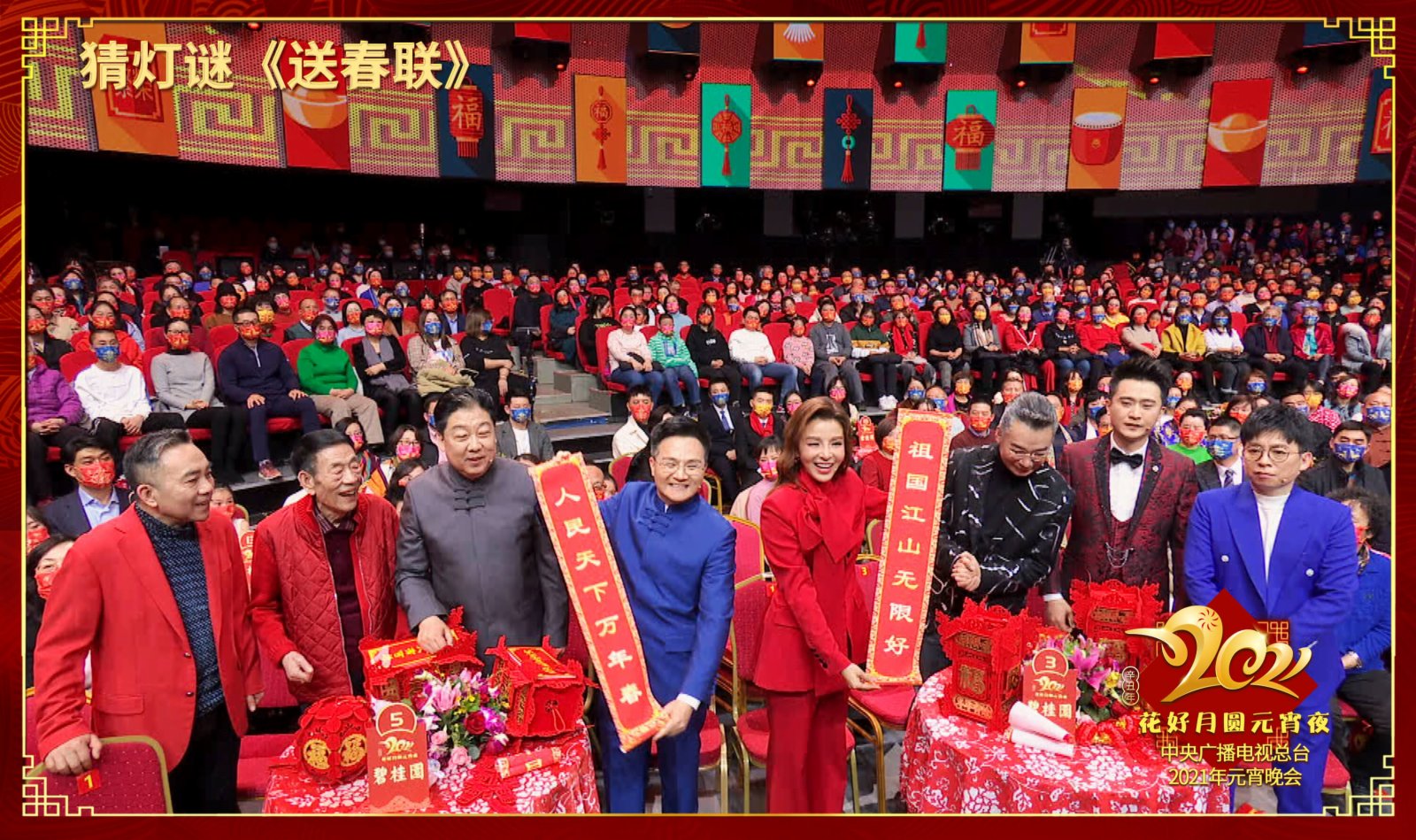 品元宵、猜燈謎的傳統習俗也被巧妙地穿插在節目中,彰顯了傳統文化之美。總台主持人與相聲演員分為兩組,互動打擂鬧元宵。拜年、送春聯等環節妙趣橫生,將年味兒詮釋得淋漓盡致。在這個「千里共嬋娟」的時刻,向全國各族人民、港澳台同胞,以及全球的華僑華人朋友們送上節日的深情祝福,用對聯等形式鼓勵大家奮鬥耕耘,再創佳績。