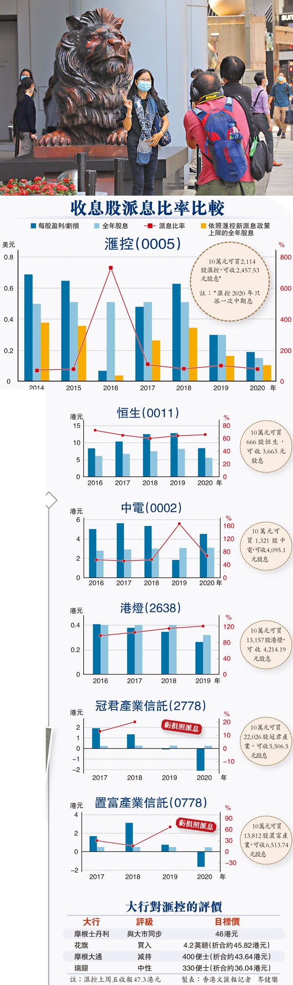 滙控去年受英國監管機構要求,年內不派息不回購,令不少香港小股東心碎。上周該公司派成績表,一如預期宣布恢復派息。該行決定每股只派2020年度第4次中期息0.15美元,金額較兩年前的0.21美元少。此外,滙控宣布兩項重要的派息政策:一是不再有以股代息選項;二是公司明年起,將採用以每股盈利40%至55%的新派息政策,並可就非現金重大項目靈活調整每股普通股盈利。