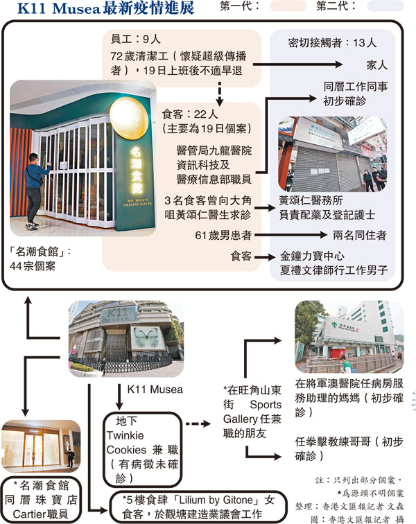 尖沙咀K11 Musea「名潮食館」群組昨日再多10人確診,累計44人染疫。衞生防護中心傳染病處首席醫生歐家榮昨日表示,有19名確診食客曾於2月19日中午到場用餐,懷疑其中一名食肆員工是超級傳播者。他又指,群組已出現二代傳播,食客的密切接觸者接連確診,其中有3名確診食客曾於2月22日及24日下午4時至6時到大角咀黃頌仁醫務所求醫,診所一名護士其後亦染疫,同時間到診的人士均被列為密切接觸者。●香港文匯報記者 唐文