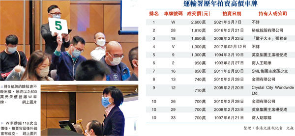 運輸署昨日舉行農曆新年車輛登記號碼拍賣,當中車牌「W」的競投激烈,經過118口叫價後,最終被一名神秘男子以2,600萬元天價成交,打破5年前無字頭28號車牌的1,810萬元最高成交價紀錄。優質幸運車牌中心負責人顏文翰表示,「W」車牌代表「Win」(勝利),屬頂級車牌,他也受兩名客人委託競投該車牌,「本身預咗1,800萬元,無諗過對手出手更闊綽,最後無功而返。」●香港文匯報記者 文森