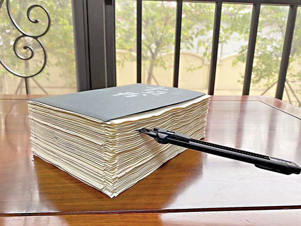 在今天這個時代,讀紙質書已經成為需要挽救的行為了,更何況讀毛邊書。聽千夫長說他在讀自己毛邊書的過程,讓人深感過癮。他說自己︰「一天陶醉在刀與紙的廝殺中,太治癒了。裁出了一本毛邊書出來,自己都愛不釋手。」用藝術家舒勇的話說︰「《千頁書》就是觀念藝術作品,我看也可以拿去參加藝術展了,作品名就叫《千頁書》。」想想倒也是,如今肯花出時間來,讀一頁、裁一頁,再讀一頁、再裁一頁的傻人着實不多了,現在的聰明人都在拚命想怎麼能夠快一點、再快一點。快到了只能讀微博體、微信體,以至於到了當下最火的「抖音體」已經沒有文字的地位了,只剩下聲音和圖像,而且都是網上下載的幾首千篇一律的素材。