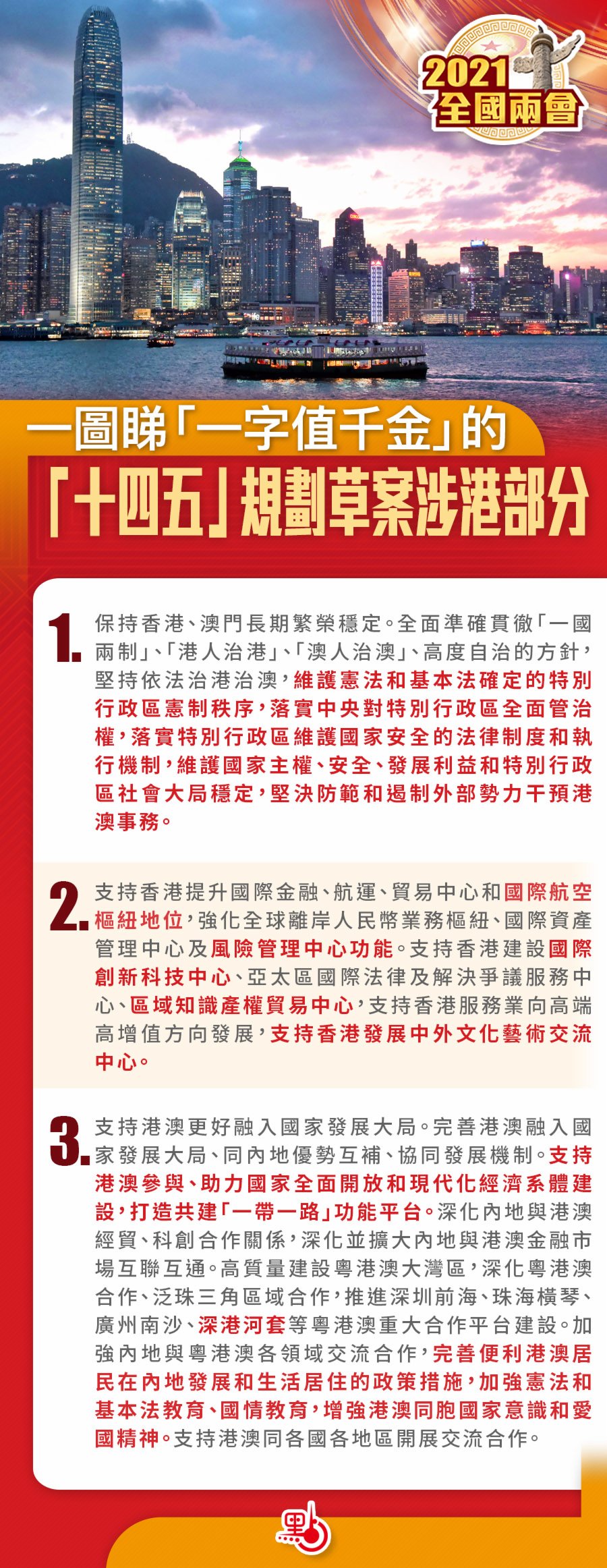 大公文匯全媒體報道:十三屆全國人大四次會議正在審議「十四五」規劃綱要草案。香港特區行政長官林鄭月娥日前表示,香港遠景能寫進國家五年計劃內,絕對是「一字值千金」,「十四五」規劃涉及支持香港的500多字將為我們帶來無限機遇。「十四五」規劃綱要草案的涉港內容有哪些?與「十三五」規劃相比有哪些新提法?大公文匯全媒體為您整理好了「十四五」規劃綱要草案涉港部分的要點,快來睇下!
