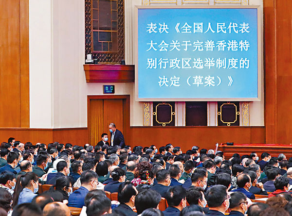 第十三屆全國人民代表大會第四次會議審議了全國人民代表大會常務委員會關於提請審議《全國人民代表大會關於完善香港特別行政區選舉制度的決定(草案)》的議案。會議認為,香港回歸祖國後,重新納入國家治理體系,《中華人民共和國憲法》和《中華人民共和國香港特別行政區基本法》共同構成香港特別行政區的憲制基礎。香港特別行政區實行的選舉制度,包括行政長官和立法會的產生辦法,是香港特別行政區政治體制的重要組成部分,應當符合「一國兩制」方針,符合香港特別行政區實際情況,確保愛國愛港者治港,有利於維護國家主權、安全、發展利益,保持香港長期繁榮穩定。為完善香港特別行政區選舉制度,發展適合香港特別行政區實際情況的民主制度,根據《中華人民共和國憲法》第三十一條和第六十二條第二項、第十四項、第十六項的規定,以及《中華人民共和國香港特別行政區基本法》、《中華人民共和國香港特別行政區維護國家安全法》的有關規定,全國人民代表大會作出如下決定: